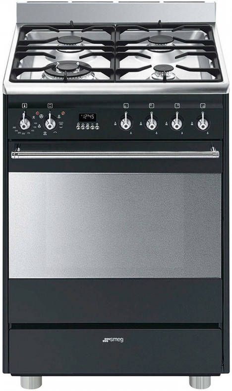 Dit vrijstaande Smeg SNLK61MA9 gasfornuis in zwart, met energielabel A, heeft 4 gasbranders en een hetelucht-oven met een inhoud van 70 liter. De Multifunctionele oven heeft 7 functies. Bij dit fornuis wordt een wokring meegeleverd. De specifieke Vapor Clean functie vergemakkelijkt het reinigen en onderhoud van de oven. Op de bodem van de oven bevindt zich de speciale Vapor Clean cirkel. Wanneer hier water in wordt gedaan en het Vapor Clean programma wordt geselecteerd, zal de oven het water omzetten in stoom, waardoor het vuil in de oven wordt los gestoomd. Hierdoor wordt het reinigen van de oven aanzienlijk vergemakkelijkt.Gaskookplaat:- 4 gasbranders-1 wokbrander linksvoor 3.5 kW- 2 normale branders rechts- en linksachter 1.80 kW- 1 kleine brander rechtsvoor 1.00 kW- Grill element: 1,70 kW- Elektronische vonkontsteking in de knoppen- Thermobeveiliging- Gietijzeren pannendragers- Vangschaal één geheelOven:- 7 functies- Onder en bovenwarmte- Onderwarmte- Luchtcirculatie met grote vlakgrill- Grote vlakgrill- Luchtcirculatie met onderwarmte- Hete lucht multifunctioneel Vapor Clean functie- Timer en automatische in- en uitschakeling- Temperatuur instelbaar van 50° 260°C- Mantelkoeleing- Uitneembare ovendeur, dubbel glas- Binnenzijde oven voorzien met Ever Clean emailleAfmetingen (hxbxd) 87,5-93x60x60cm.